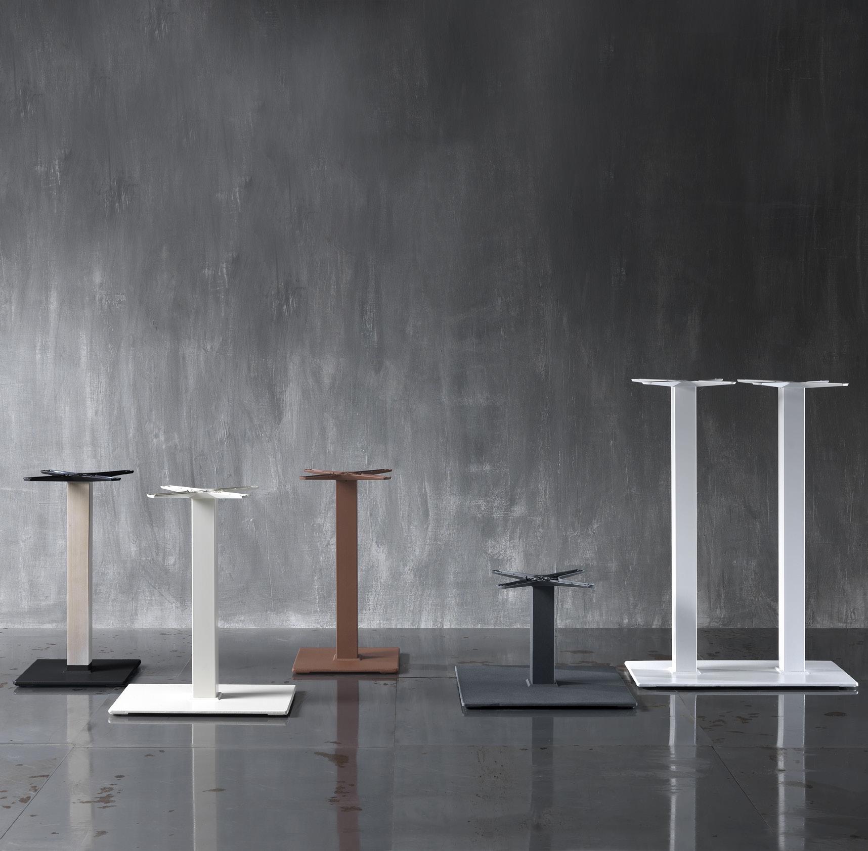 The Q Inox collection features satinfinished steel bases with square geometries and PF Stile’s signature step between base and column. Available with single or double columns and in multiple finishes.
