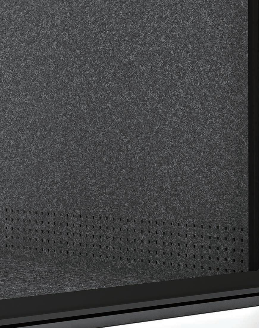 The frame of the Collaborative Room consists of solid plywood paneling, covered in technical fabric with high sound absorption features, and tempered glass modules that guarantee a high degree of acoustic insulation from the external environment, up to 36 dB.