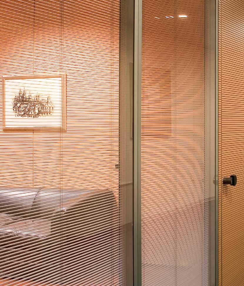 Available in vertical or horizontal design modules in single or double tempered glass. Panels are produced to the highest standards of acoustic, insulation and visual privacy. Opaqueness is achieved as glass can be silk screen printed, frosted or sandblasted.