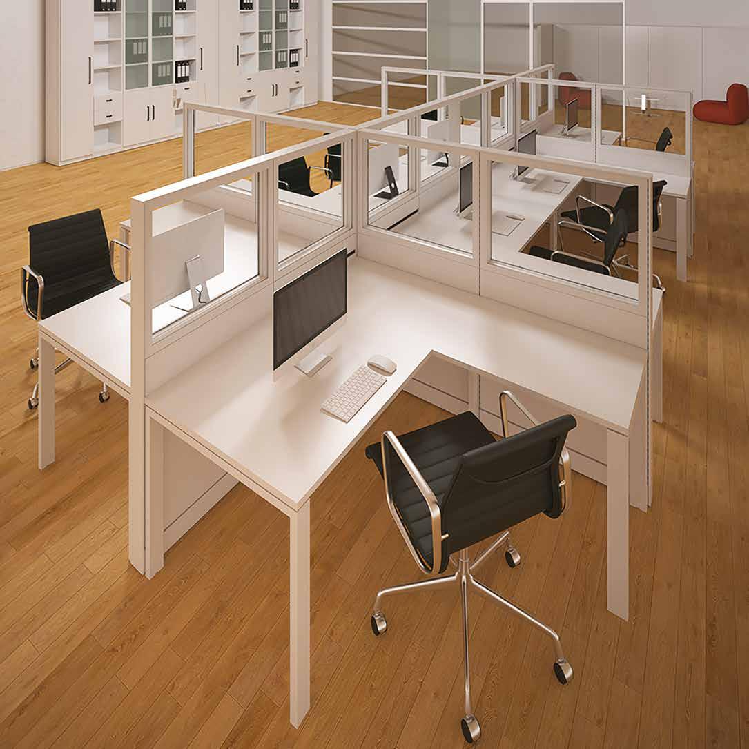 La semplicità di assemblaggio consente di realizzare scrivanie singole, dattilo e bench in tempi brevissimi; la stabilità e il design moderno inseriscono questa linea in ambienti di lavoro dinamici.