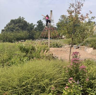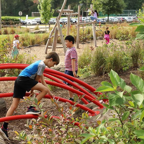 Nature play helps build more resilient places and more resilient people. Rain gardens clean and store stormwater. Including native species increases biodiversity. Adding trees and shrubs reduces temperatures. Utilizing local logs and boulders for play is a sustainable choice with a lower carbon footprint.