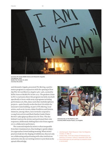 and Alexandro Segade, presented The Meeting, a performance program in conjunction with the opening of Now Dig This! Art and Black Los Angeles 1960–1980, curated by Kellie Jones at MoMA PS1 in late 2012. The geodesic dome in PS1’s courtyard, where this program was held, was built specifically to host a wide array of programs including performance art, film, dance and other multidisciplinary projects—quite literally works that don’t fit within the museum’s main building. As part of The Meeting, local artists, such as niv Acosta, Adam Pendleton and Xaviera Simmons, among others, were invited to respond to a song from activist and Black Panther leader Elaine Brown’s 1969 agitprop album Seize the Time. The duo behind Courtesy the Artists each performed their own responses, deliberately shifting their roles from organizers to collaborative performers. The curatorial impulse by artists is often inseparable from their visual practices, thus leading to openly subjective approaches toward making meaning. When artists’ practices leak into the shaping of exhibitions, they not only are collaborating and performing with other institutions and artists, but also are inviting viewers to join them in the spread of knowledge.