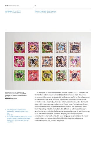 1. Fan Zhong (quoting Carmela Zagari Rammellzee), “Alternate Universe,” W 41.3 (Mar 2012): 188. 2. “Excerpts from Ramm: �ll:z ��’s Iconic Treatise of Gothic Futurism.” post.thing.net, accessed September 19, 2013, http://post.thing.net/ node/3086.