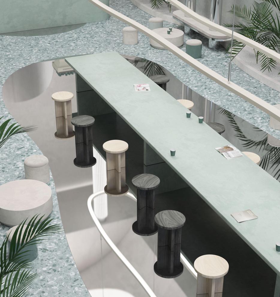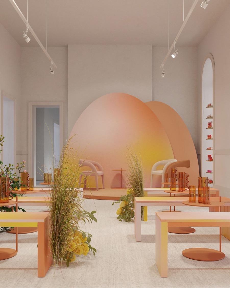 A pop-up experience conceptualised for the beauty space. Feelings of intrigue and excitement are the catalyst for creativity, resulting in the creation of a unique shape rich in volume and natural light. Warm tones of plaster, stone and beige draw inspiration from the natural surroundings, while a looming skylight invites it in.