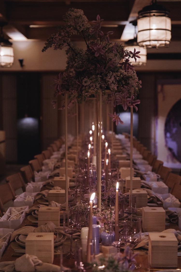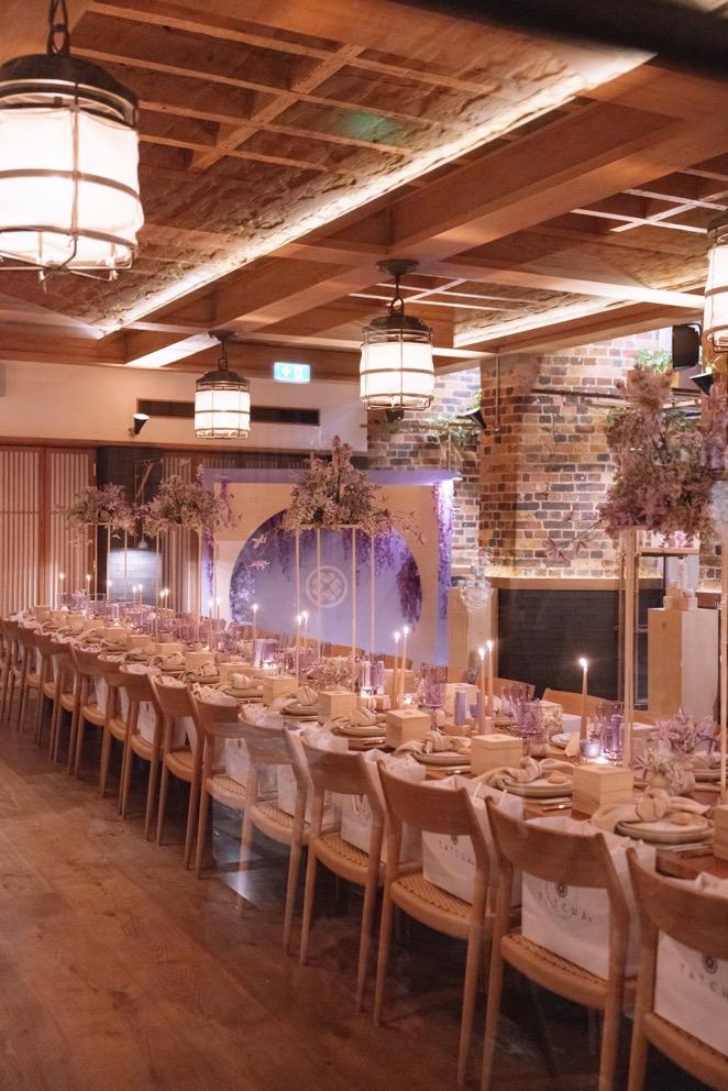 For the tablespace, we created a cloud of purple florals overshadowing the wooden and purple setting. We created mini wooden plinths for all of the product display. We were inspired by the Japanese heritage of the brand, and created wooden pots of Sakura seeds for each guest to take home with them to plant. We also created a stunning photo display with purple florals peeking through. We transformed the space at SpaceNK with the brand’s modern yet simplistic branding, with wooden chairs, and beige draping around the room. We created a curved stage, with a purple backdrop for the founder’s masterclasses.