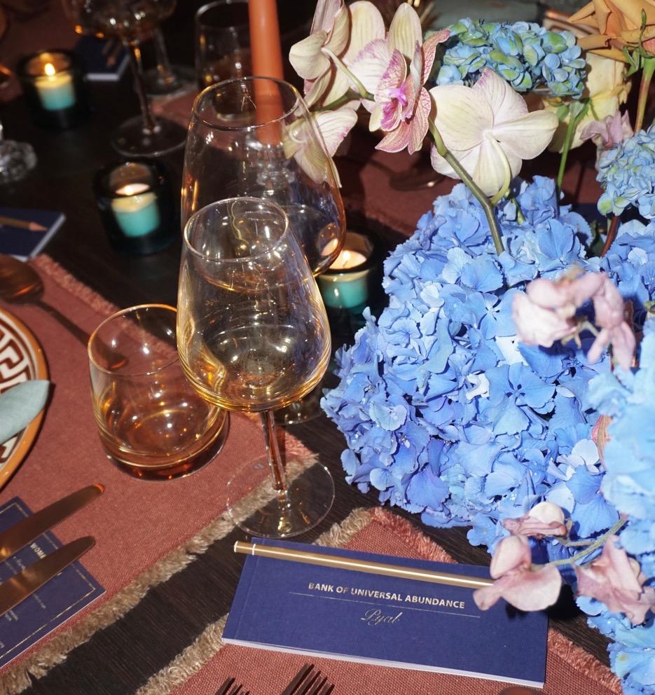 We designed a bronze-inspired tablescape featuring ornate graphic plates that featured a hand-painted design of each guest’s star sign. For a finishing touch, we intricately embroidered guests’ names onto the napkins, and in the spirit of giving, created custom cheque books filled with charming affirmations. To appease our guests’ appetite, we worked alongside a vegetarian caterer to curate a wholesome dinner for everyone to enjoy.