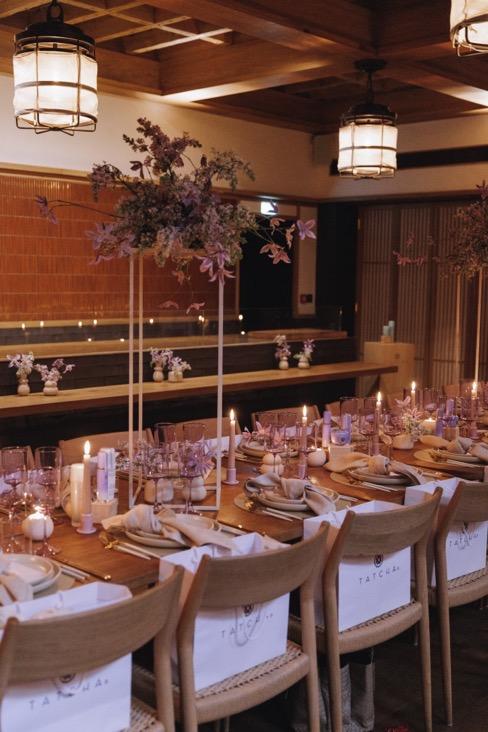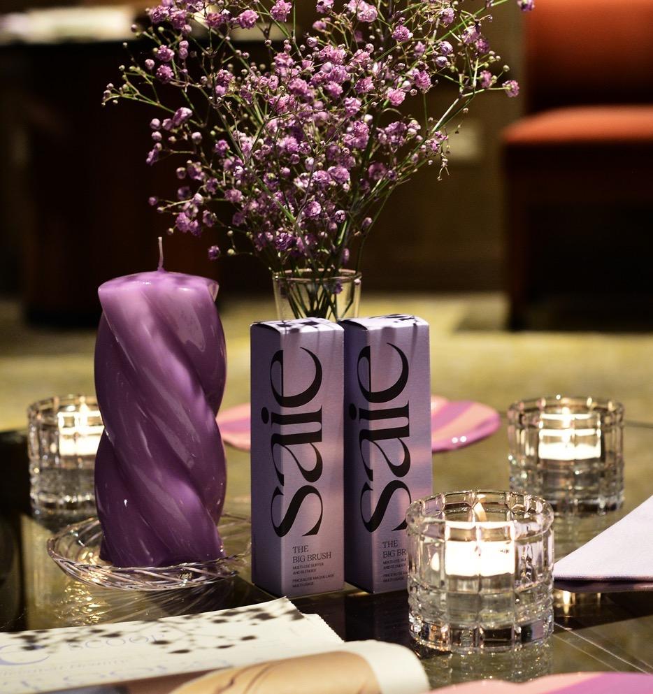 The experience began with a welcome dinner, featuring a designed tablescape celebrating the brand’s signature colour lilac brought to life with baby breaths and embroidered napkins. We carried this design through to the hotel suite, where guests enjoyed branded Moëts, newspapers and towels and danced to a DJ that played music from a special Saie booth.