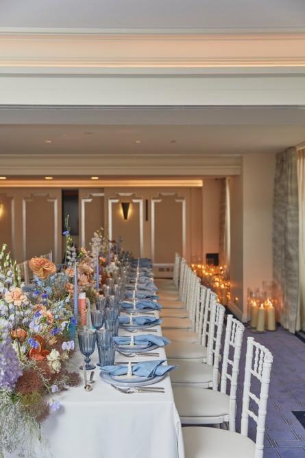 We worked with Unilever Prestige to create a dinner setting at Claridges Hotel to celebrate all their prestige brand founders they work with. The colour scheme was spring-inspired, with tones of blue running through the design and floral arrangement. The tableware matched this theme – with blue plates, glassware and napkins to complement the stunning bouquets that surrounded them.