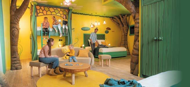 is, de ander springt als een gek op het bed. Ik beh oor tot die laatste categorie. Het fenomeen ‘een goei hotelbed’ overschrijdt provinciegrenzen. Het matras moet zacht genoeg zijn dat je vormen een korte afdruk achterlaten als je opstaat, maar ook niet zo zacht dat je er helemaal in wegzakt. De kussens moeten abundant aanwezig zijn om op z’n minst de optie van een kussengevecht te hebben en de dons moet zo gefabriceerd zijn dat het zich perfect afstelt op je lichaamstemperatuur. Drie op drie, in het geval van het dubbelbed in de Maya de Bij-kamer. En wie het decor hoog in het vaandel draagt zit hier ook wel goed: de piekfijne details en zorgvuldig geplaatste spots maken je het hoofdpersonage van je eigen Maya-wereld. Nooit gedacht dat ik ooit met plezier een bijtje zou zijn. 19.24 uur: Na een korte powernap en eerste verkenningstocht van het pretpark geeft mijn buik het signaal dat het energie nodig heeft. Ook inbegrepen in de prijs voor een overnachting: het Avondbuffet in Le Grand Buffet. Kleine tip: zorg dat je honger hebt, want kiezen wat er op je bord komt te liggen wordt het moeilijkste moment van de dag. Van op en top Belgische gerechten zoals stoofvlees met frietjes of een voor je neus gebakken steak naar vegetarische lasagne en smeuïge lichtpikan- te curry met rijst: als je een rondje langs het buffet loopt ben je