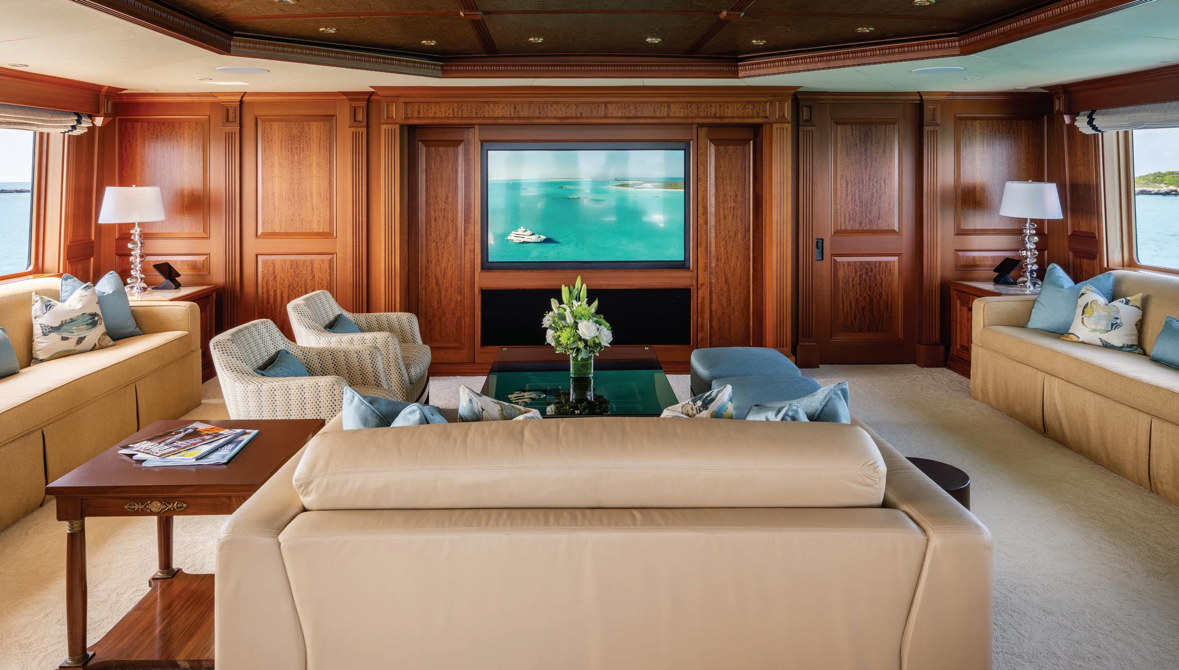 Custom-made furnishings finished in opulent woods and elegant neutral fabrics transform the interior as a seamless connection to the picturesque landscape. CROSSED SABRE’S ample interior encompasses panoramic views. Gather in the formal dining salon for a delicious meal or delight in an early evening wind down in one of her many living spaces.