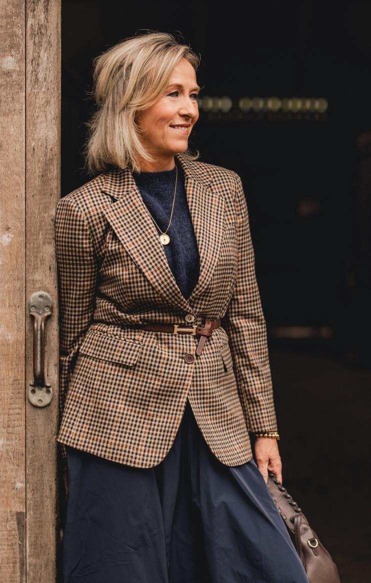 Robuuste elegantie ontmoet vrouwelijke charme met aardetinten, ruitpatronen en luxe breisels. Perfect voor een stijlvolle herfst vol karakter en warme, tijdloze uitstraling.