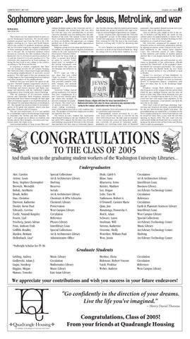 Sophomore year: Jews for Jesus, MetroLink, and war By Molly Antos Senior Forum Editor This school year saw improvement in many areas for Washington University. The overall undergraduate program rose from the 14th to the 12thhighest ranking in U.S. News and World Report, which also ranked 19 graduate programs among the top 10 in their respective categories. Highlights of these rankings include the School of Medicine’s rise to become the second-best medical school focused on research, the Olin Graduate School of Business’s rise to 29 from its previous position of 31 and the School of Art’s new position of 21. The University also improved in its food rankings, offering the best food of any college in the country, according to The Princeton Review. In response to student complaints that there was not enough security for off-campus housing, the University Police Department began patrolling surrounding neighborhoods of university-owned property. The other goal of this new program was to help improve the relationship between students and other members of the neighborhoods. Students this year were given the option of taking new “themed” English composition courses to fit their interests. The different options included Technology and Society, Journey and Quest, Language and Identities and the traditional English composition class, Writing and Critical Thinking. With the assistance of 18 University student interns and Chancellor Mark Wrighton, alumnus and balloonist Steve Fossett brought the Bud Light Spirit of Freedom capsule to its final destination at the National Air and Space Museum in Washington D.C. The capsule was used in Fossett’s circumnavigation of the globe last summer, which took him four days, 19 hours and 50 minutes. The one-year anniversary of 9/11 was marked by a candlelight vigil in the Brookings Quadrangle to remember the victims and their families. Almost 1, 000 people sat in silence as students and faculty shared their thoughts, reactions and experiences about the tragic event. Controversial author of “Step Across This Line”
