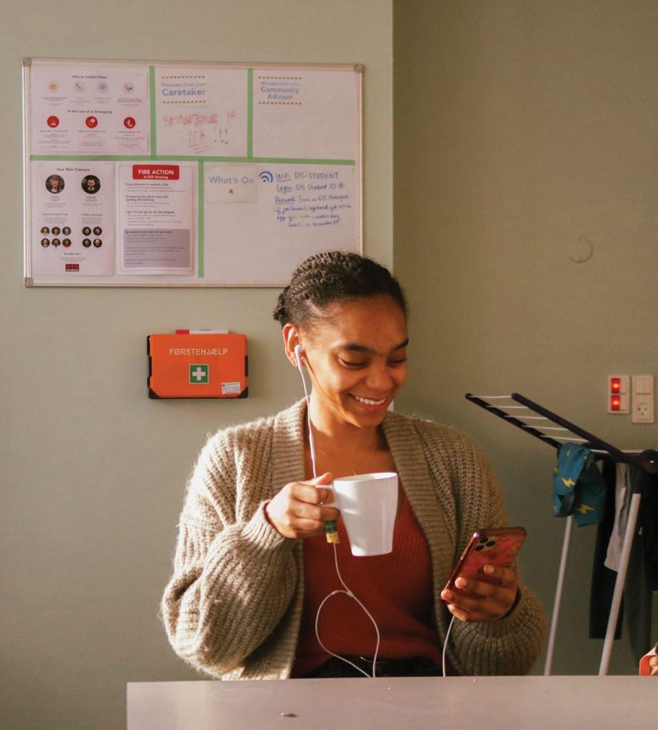 “DIS has a great support system and it fosters so much community. I have found great friends through the LGBTQIA+ affinity group and also in my housing, where we make use of our common spaces and host Tuesday reality TV show nights or craft nights. All those options made it pretty easy to find a support system and a community And even when I had harder times, I was able to talk to the DIS Care Team for support, which helped a lot.”