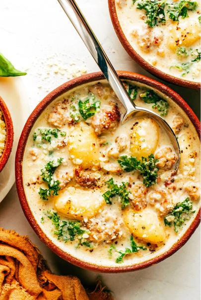 Simmer.Addthechickenstockandstirtocombine.Continue cookinguntilthesoupreachesasimmer.Addthegnocchi,kale, heavycream,androastedredpeppersandstirtocombine. Cookfor2minutesoruntilthegnocchifloattothesurfaceofthe soup.