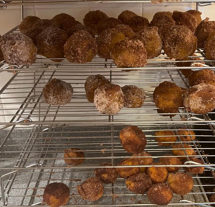 8.Takeeachdoughnutholeanddunkitintothemelted butter,makingsureitisfullycoated.Thendipitintothe cinnamonandsugarmixture,makingsuretocoatwell.