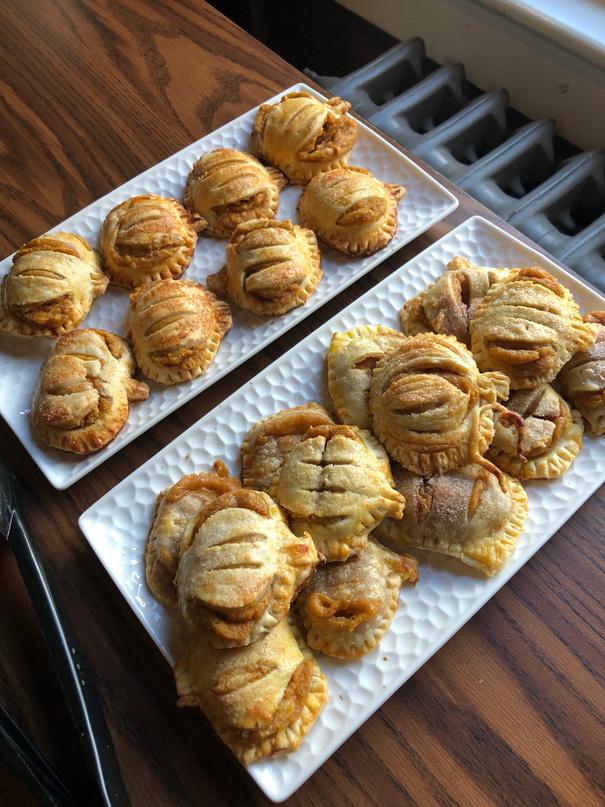 12.Placetheventedpumpkinsontopofthefilledpumpkins andgentlypressdownontheseamstosealthepiesshut. Thencrimptheedgeswithaforkandbrushthesurfaceof eachpumpkinwiththeeggwash.
