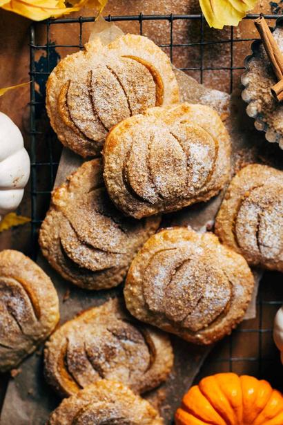 Usingapumpkin-shapedcookiecutterorahomemade pumpkintemplate(Imademineoutoftheboxthepie doughcamein),cutoutyourpumpkins.Rolloutthescraps tocutoutafewmorepumpkins.Youshouldbeabletoget about10pumpkinspersheet.