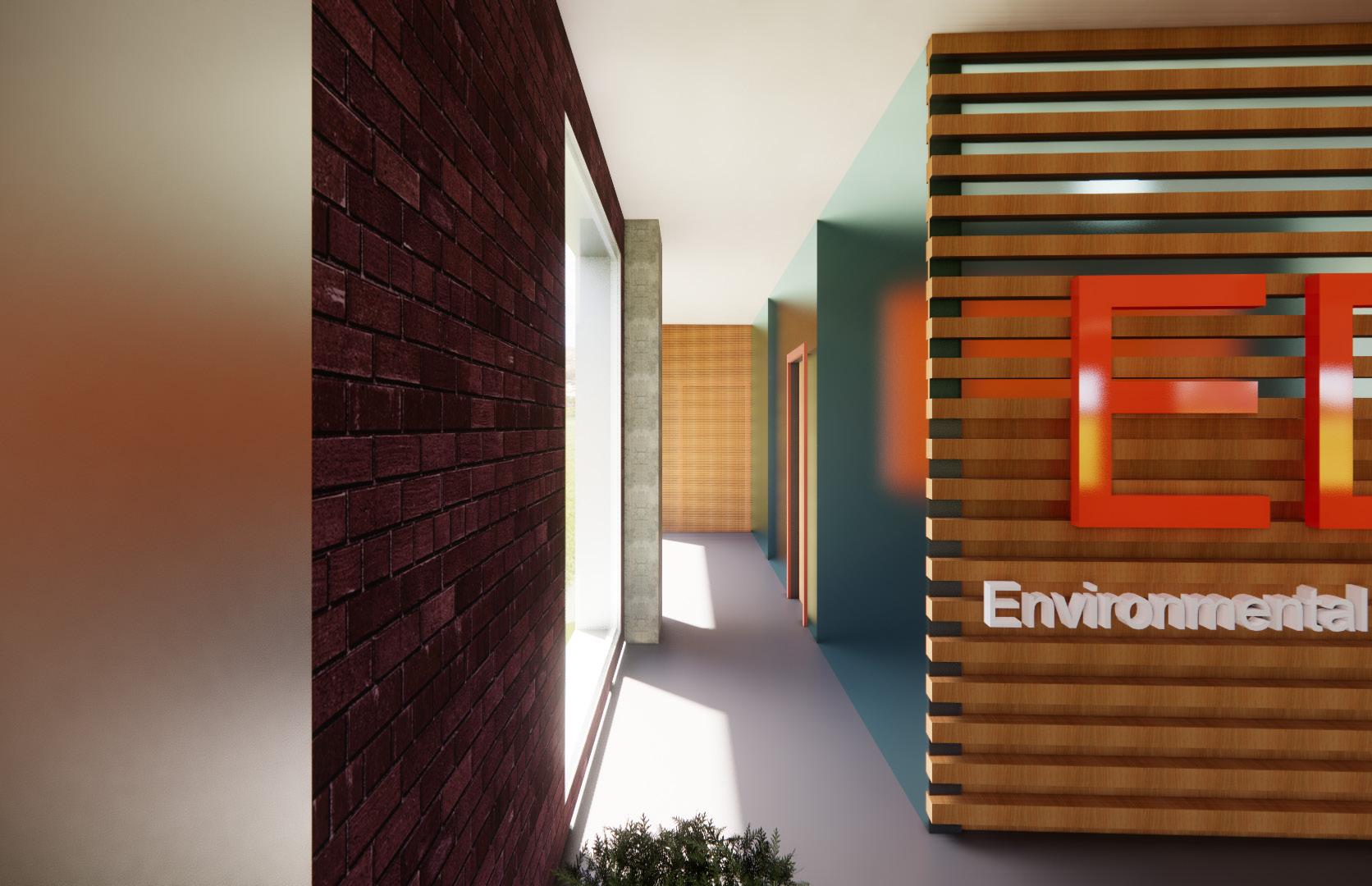 A storage room sits outside of the offices, continuing the hallway through to the lobby area.