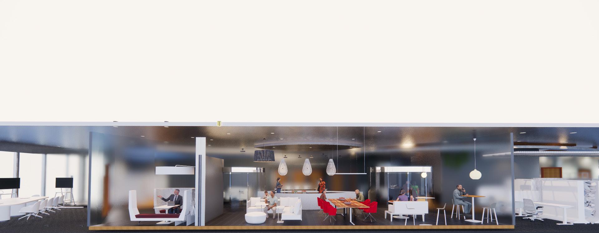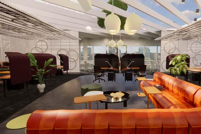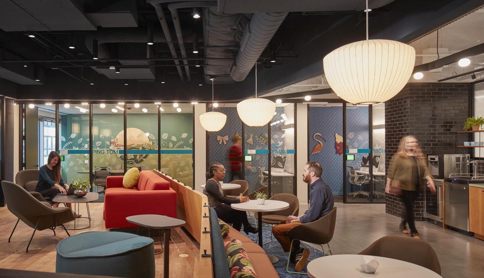 providing focus, collaborative, social, and flex areas and continuing the space’s motif in the cafe allows workers to choose their lunch experience