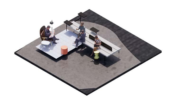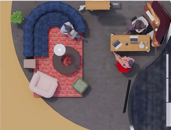 the central area provides connection between the relaxed and focused workspaces, whilst also providing hybrid access to both areas.