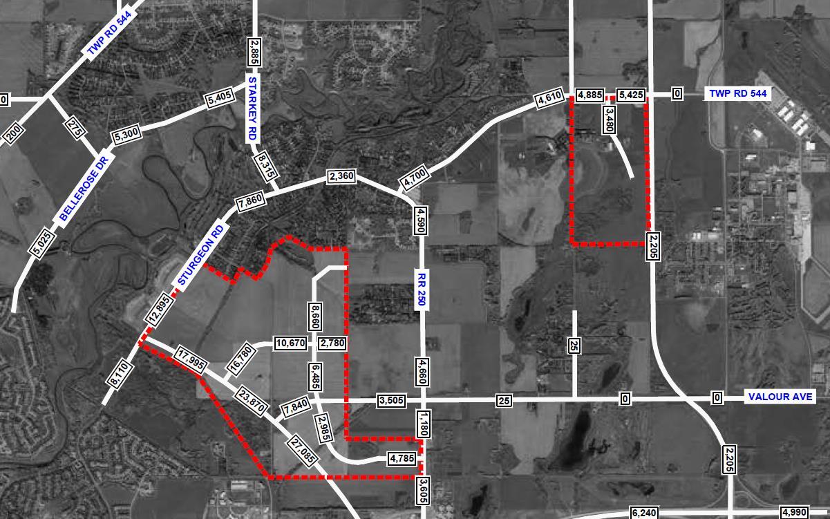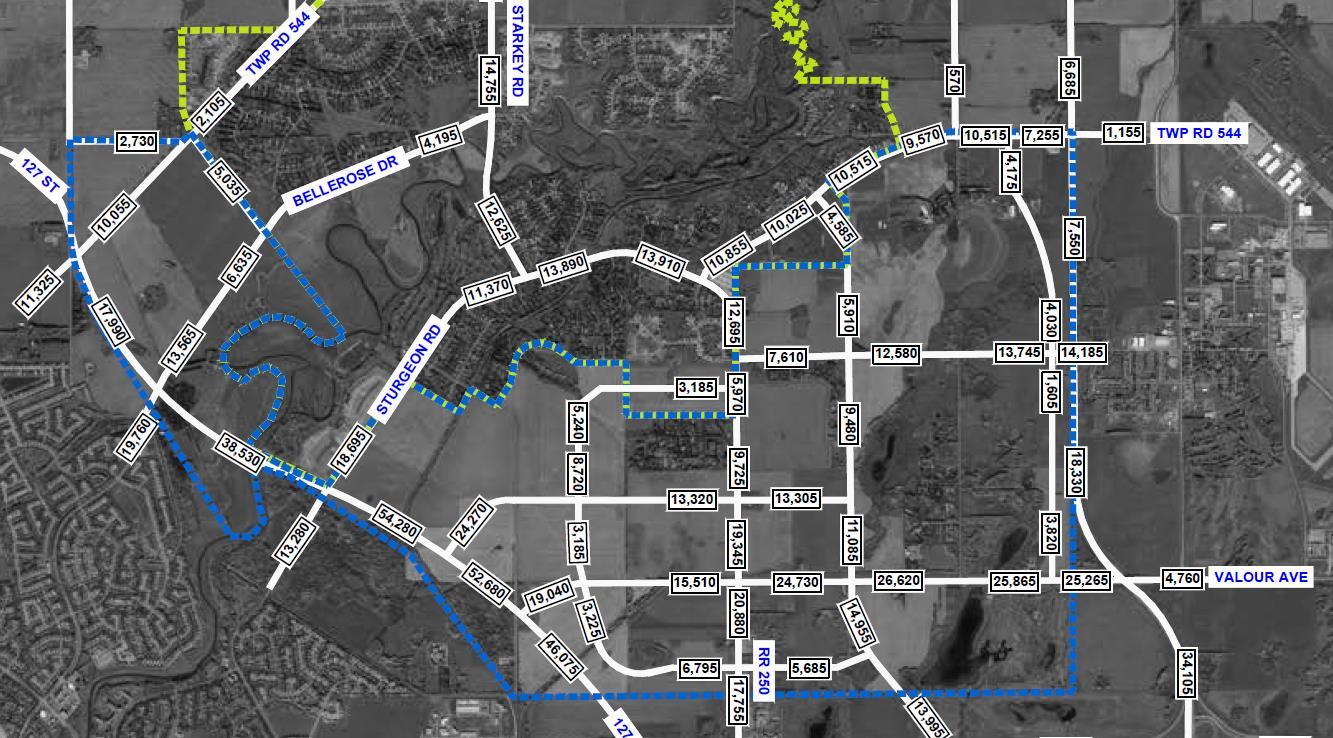 Sturgeon Road is considered an east-west arterial that provides an important connection within the County, specifically through the Sturgeon Valley, however it does not provide significant travel benefits for provincial or trade connectivity. Although Sturgeon Road connects directly to Highway 28, the primary role of the corridor is to facilitate local traffic traveling to and from the adjacent residential developments. This is observed by existing traffic patterns where the corridor volumes on Sturgeon Road are highest between Starkey Road and Essex Point and volumes decreases on either ends towards St. Albert and Highway 28. Future traffic growth on the corridor is also anticipated to mainly be local growth and resident traffic. It is noted that there is some connectivity provided between neighbouring municipalities – most predominantly with St. Albert and to a lesser extent the City of Edmonton.