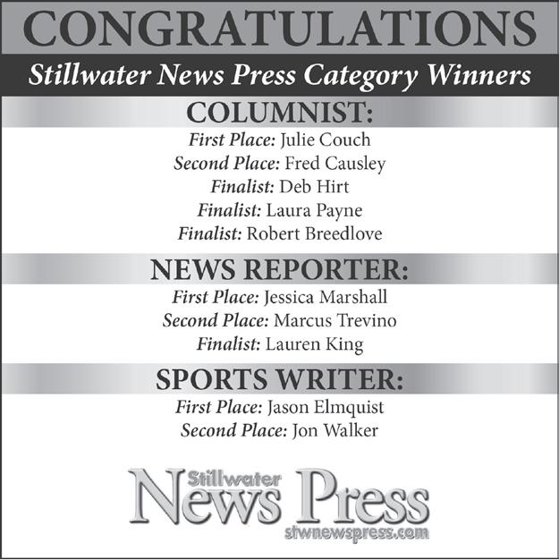 Every year the readers of The Stillwater News Press and followers of our social media platforms, website (stwnewspress.com) and E-mail Blast Communications celebrate the best businesses, organizations and people in a 2-step process. In June, they cast their nominations in the “Best of Stillwater” contest which reveals the Top 5 nominees in each category. In July, voters select their top pick from each category in hopes that their favorite will rise to the top. This Best of Stillwater Winners publication provides a resource for those who want to know the most popular places to eat, shop or purchase services, and who use this as a guide in their own consumer choices.