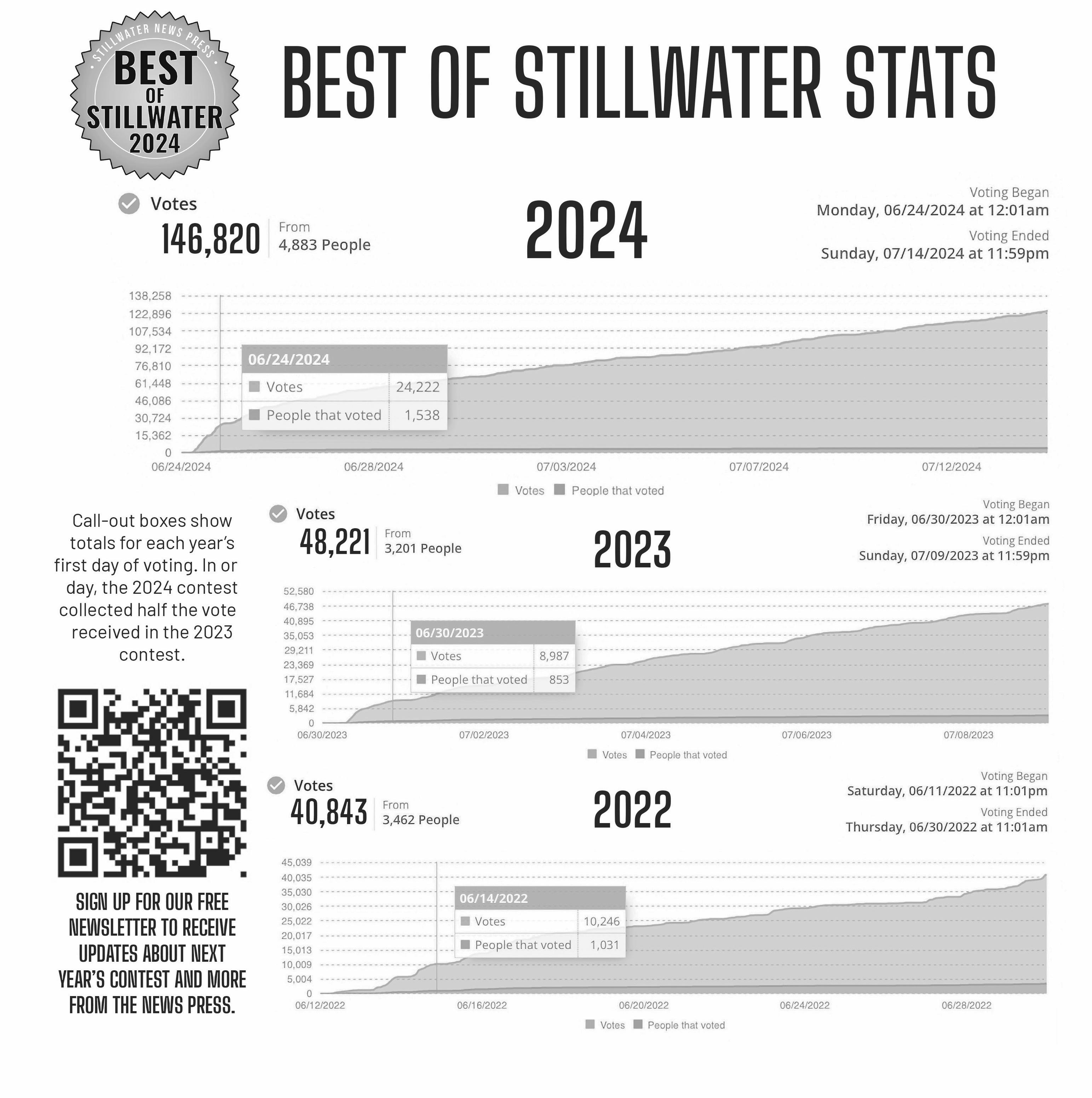 That growth means more businesses, translating into more competition for your patronage. It shouldn’t surprise us that this year’s Best of Stillwater contest has seen explosive growth among nominees and their voters. For context, last year’s contest collected 48,221 votes from 3,201 people. This year, the online ballot collected 146,820 votes by 4,883 people. Check out