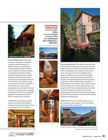 was built for a homeowner who had memories of living in Europe as a child. He loved the verticality of the castle spaces and wanted to add a tower to his one-story home. “Our challenge was to design an addition with a tower that would be appropriate in the setting of the bucolic Placer foothills, while blending easily with the one-story proportions of the existing home,” says Piches, explaining that the resulting “barn-inspired tower structure” steps down to the existing lower onestory roof with board and batt siding and a metal roof, which brings continuity to the new and existing parts of the home. The new entry features a stone-walled courtyard, which boasts an outdoor fireplace and sitting area.