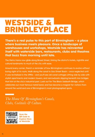 WESTSIDE & BRINDLEYPLACE There’s a real pulse to this part of Birmingham – a place where business meets pleasure. Once a landscape of warehouses and workshops, Westside has reinvented itself with waterside bars, restaurants, clubs and theatres that buzz from morning until late. The Metro trams now glide along Broad Street, linking the district’s hotels, nightlife and cultural landmarks to much of the city with ease. Around every corner, there’s a reminder of how Birmingham continues to evolve without losing sight of its roots. Walk along the canal to Gas Street Basin – once neglected until it was revitalised in the 1990s – and you’ll see old canal cottages sitting side by side with stylish apartments and modern towers, and narrowboats slipping beneath iron bridges that hint at the city’s industrial past. Look out for The Black Sabbath Bridge, which celebrates our most famous metal band, and has become a magnet for visitors from around the world and one of Birmingham’s most photographed spots.