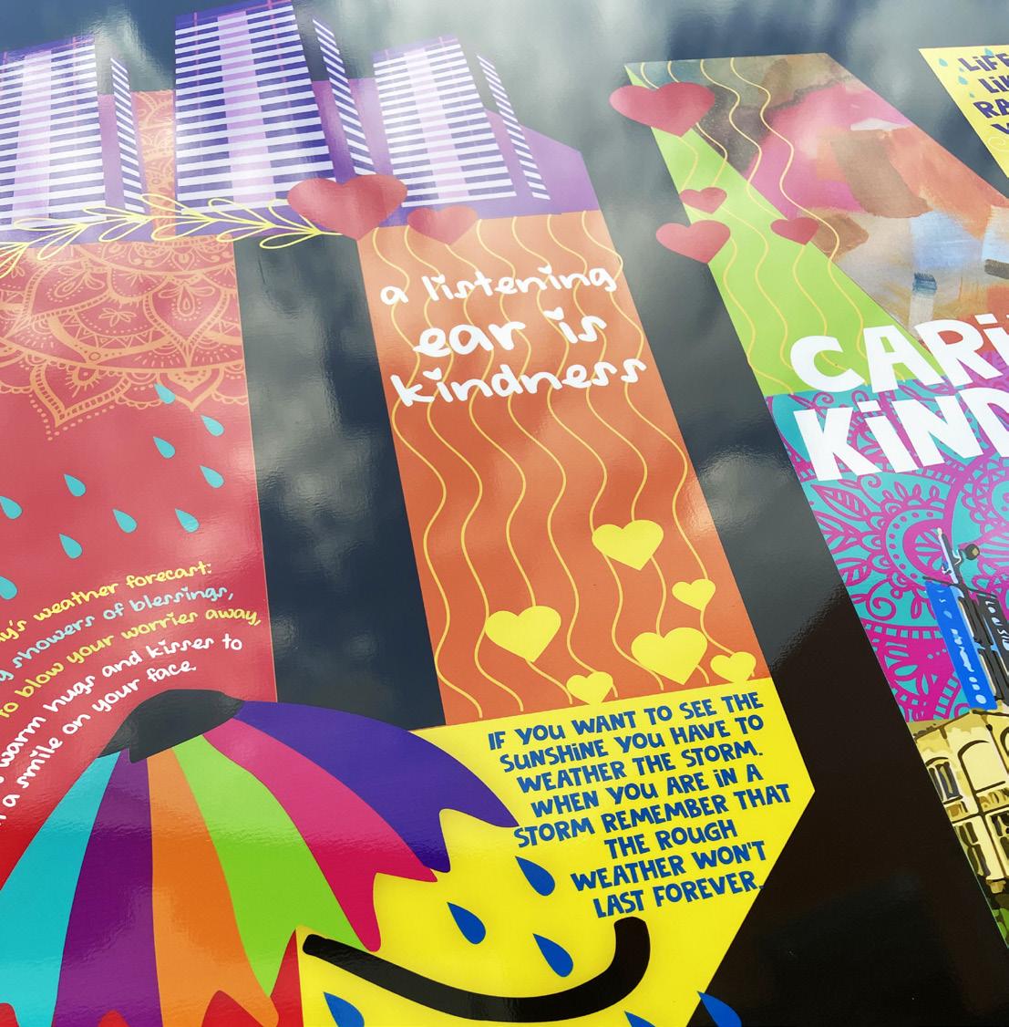 Within the piece there are numerous inspiring quotes such as 'to be there, is kind' and 'caring is kindness'. Various Rochdale landmarks can also be seen within the artwork such as Rochdale Town Hall and Rochdale Riverside.