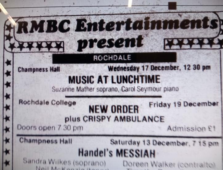 – the same building on St Mary's Gate that is now known as Hopwood Hall College – was presumably in the main hall. I remember attending public meetings there in the early 1980s. This is roughly where the Riverside Salon is now situated. Promoted by the council's entertainments department, tickets costs just £1. The support band were another Factory band, Crispy Ambulance whose singer, Alan Hempsall had once stood in for Ian Curtis at a gig in Bury.