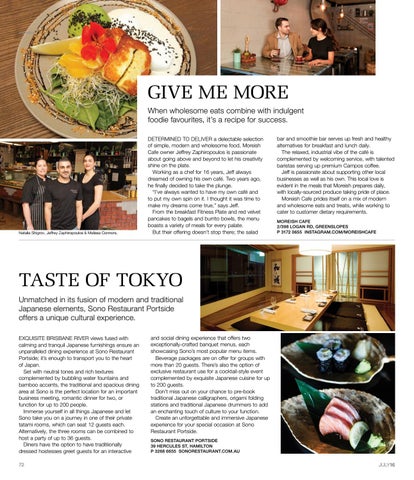 bar and smoothie bar serves up fresh and healthy alternatives for breakfast and lunch daily. The relaxed, industrial vibe of the café is complemented by welcoming service, with talented baristas serving up premium Campos coffee. Jeff is passionate about supporting other local businesses as well as his own. This local love is evident in the meals that Moreish prepares daily, with locally-sourced produce taking pride of place. Moreish Cafe prides itself on a mix of modern and wholesome eats and treats, while working to cater to customer dietary requirements. MOREISH CAFE 2/398 LOGAN RD, GREENSLOPES P 3172 0655 INSTAGRAM.COM/MOREISHCAFE