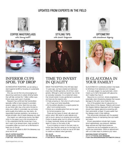 SINCE THE INCEPTION of the Wil Valor label 12 years ago, we have created and delivered more than 25,000 garments, 20 of them velvet jackets. Although a velvet suit jacket may not be an everyday necessity, it is a statement piece that should reside in every gentleman’s wardrobe and here are the reasons why: • It feels amazing on. Not only is it soft to touch, but it hugs your body beautifully. • It’s the perfect alterative to a sports jacket for after-5 and cocktail events. • Works as a versatile jacket that can be used for formal occasions, too. There are two types of velvet: silk velvet and cotton velvet. Silk velvet is quite delicate and soft to touch, giving it an amazing look and feel. Cotton is always great, but it is what you will find in cheap menswear stores and doesn’t have the depth of colour or the lustre of silk. If you’re looking to invest in the best, look no further than German velvet as it is the best in the world. German fabric is what we use at Wil Valor to create our tailored velvet garments.
