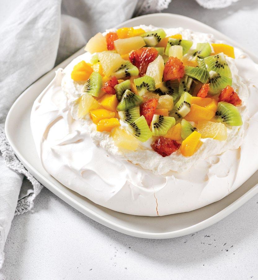 The best thing about a pavlova? You can choose whatever fresh fruit you love as topping! Miguel loves to go tropical but we also love cherries for a dramatic twist!