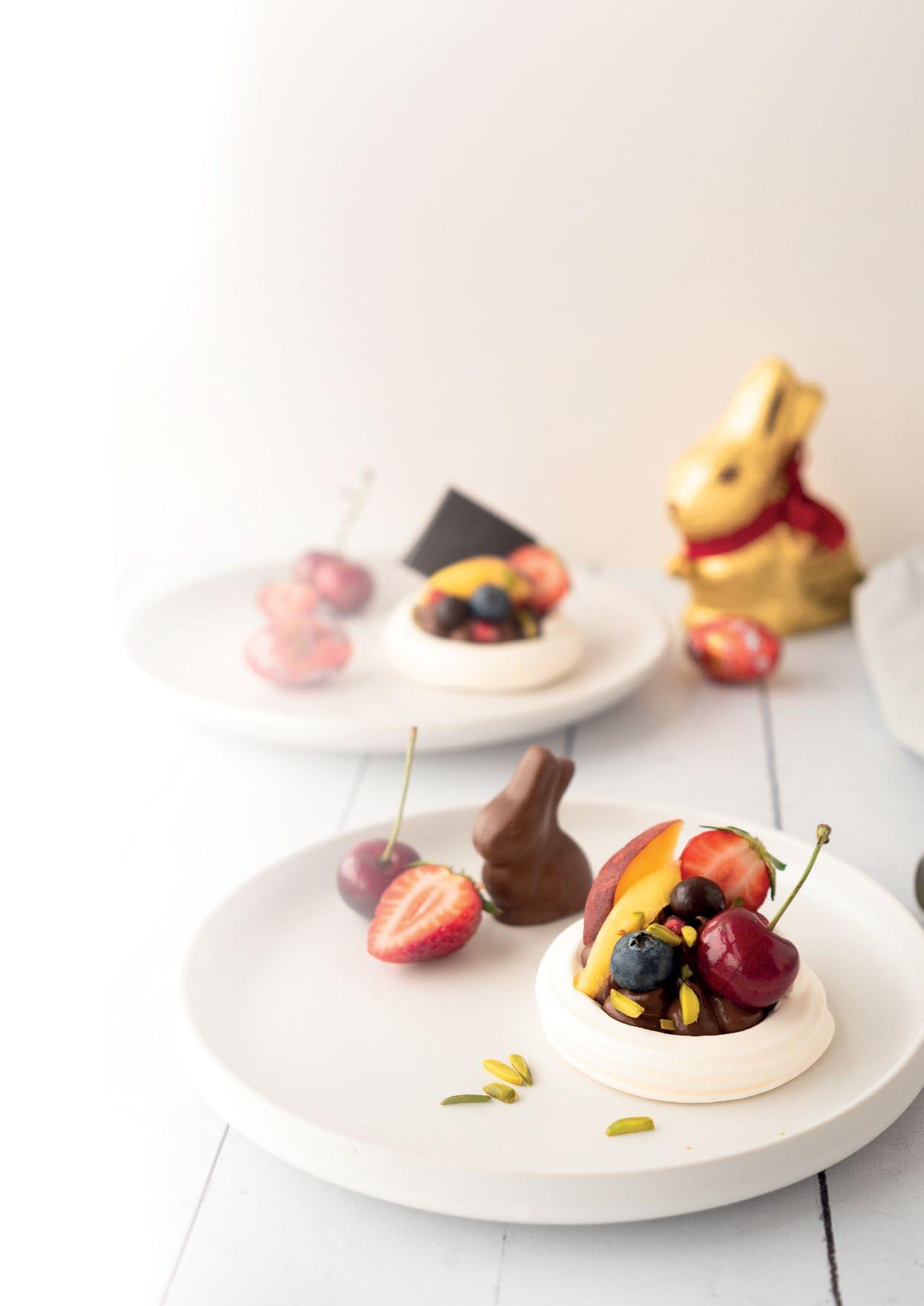 50g golden caster sugar 100ml water Pinch of salt Vanilla bean paste 140g EXCELLENCE 70% Cocoa 200g vanilla custard, quality store bought Meringue nests or mini pavlova Seasonal fruit, strawberry, blueberry, cherries, mango, peaches and pomegranate Pistachio slivers Lindt chocolate to finish such as Lindt GOLD BUNNY, squares of Lindt EXCELLENCE, FRUIT SENSATION or your favourite Lindt chocolate