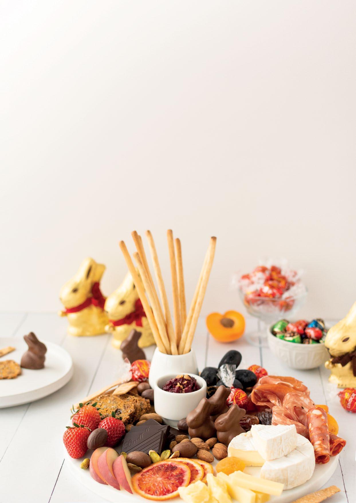 A selection of seed crackers and grissini Cheese selection (try a hard cheese like Grana Padano, a Gruyère and a soft brie or blue cheese) Some nuts and summer fruit such as apricots, peaches, berries and grapes Cured meats such as prosciutto and salami Beetroot pesto dip and a selection of fine Lindt Chocolates such as a dark, high percentage cocoa chocolate like EXCELLENCE 70% Cocoa, LINDOR Milk truffles always delight and also a great addition would be Milk Lindt GOLD BUNNY and a few mini chocolate eggs to celebrate the season