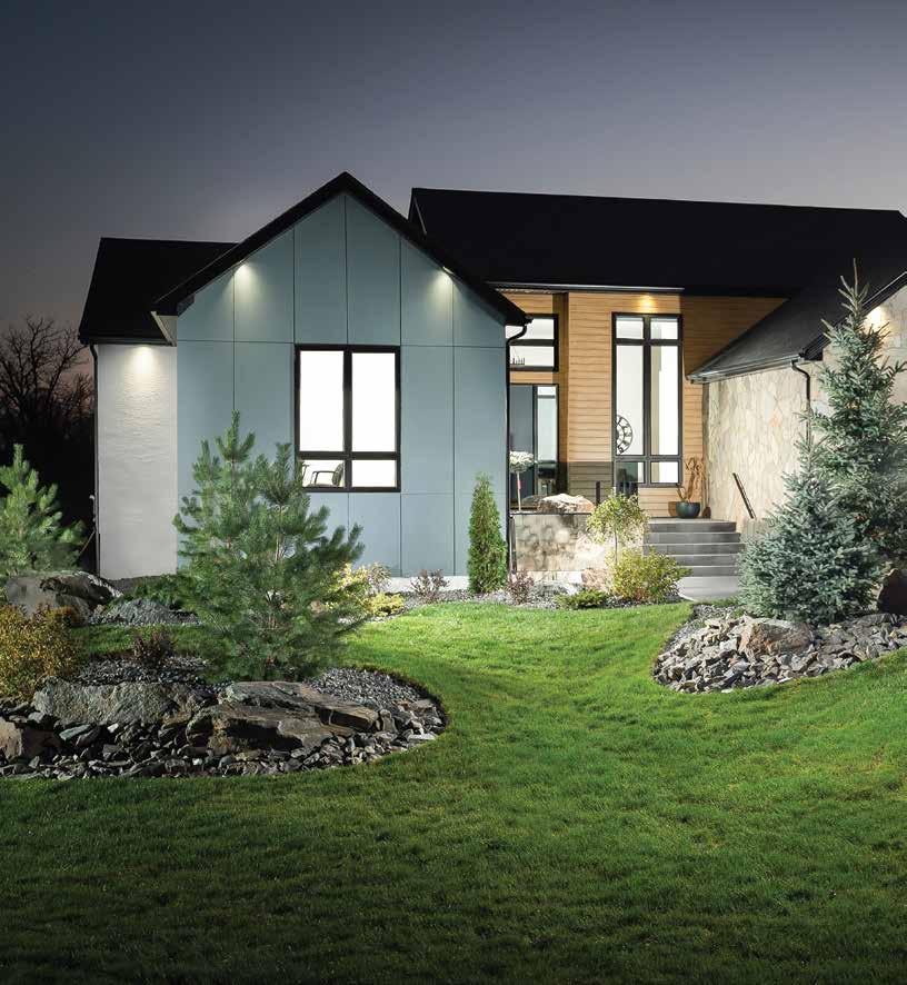 Speaking of the outdoors, let’s not forget the home’s stunning lowmaintenance exterior. The façade echoes the tones and textures of the interior, with stonework, green Hardie board and wood and black accents. The three-car garage features both a two-car and one-car entrance, each with attractive doors, supplied and installed by Creative Door. The home is nestled nicely into its surroundings, where the builder tried to leave as many of the existing trees as possible, both for privacy and aesthetics.