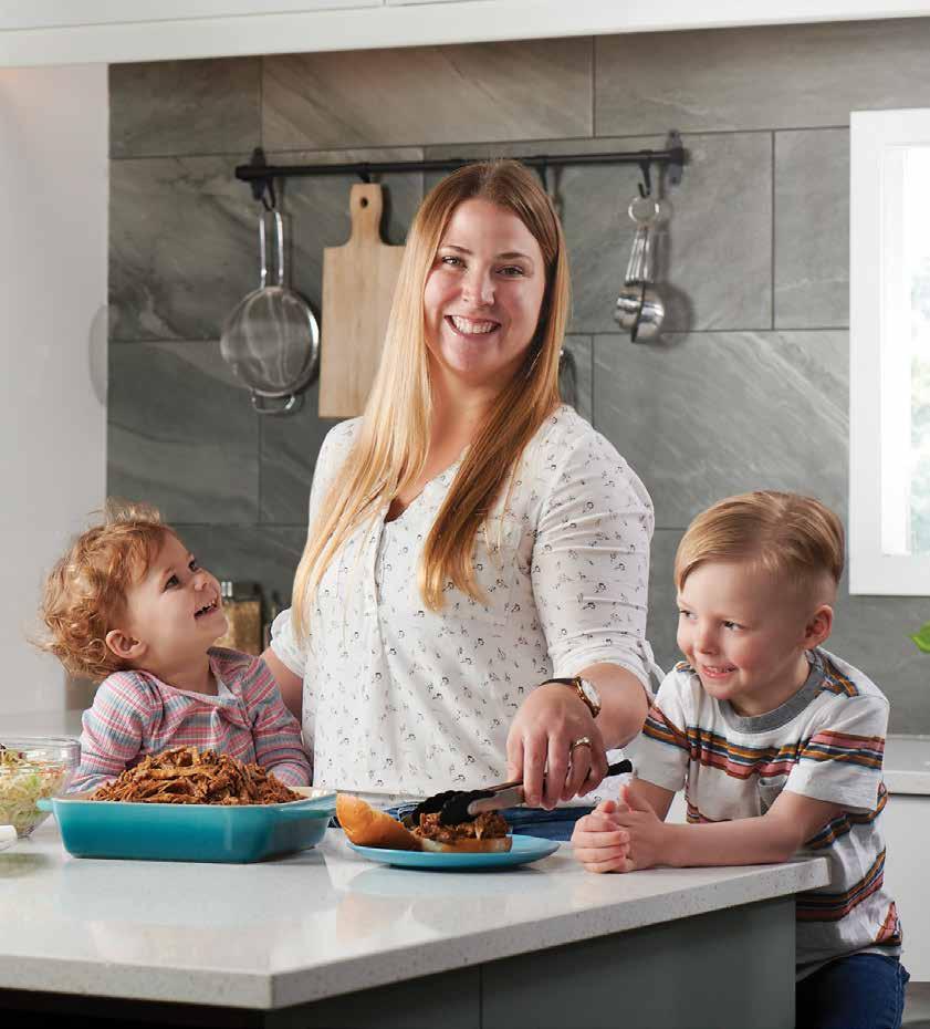 The homeowners wanted an extended peninsula for seating and entertaining, and a feature island with a slidein stove and an additional eating area. The Kitchen Craft team also opened up the kitchen entrance for a more wel-