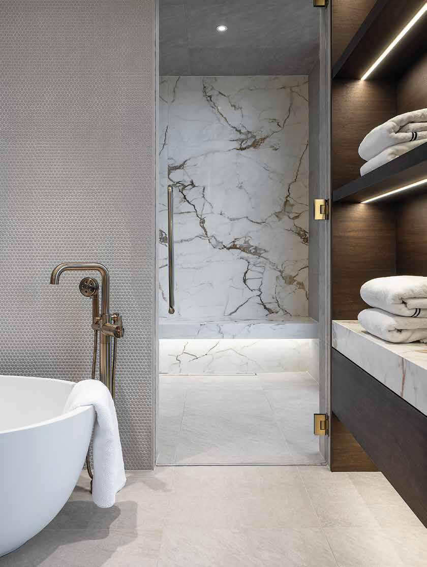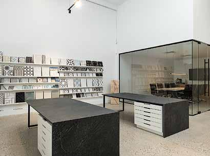 The showroom offers incredible products, but the space itself is stunning. The large-format porcelain display and Natura sintered stone island would be right at home in a contemporary, elegant house.