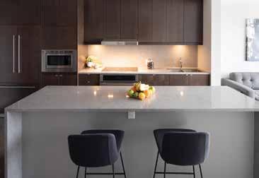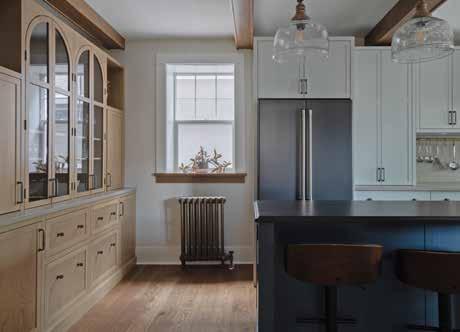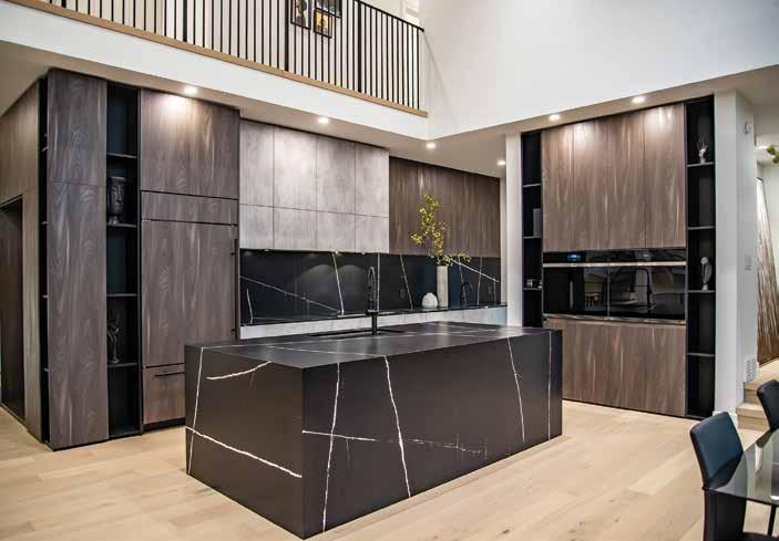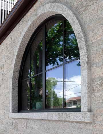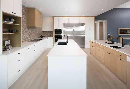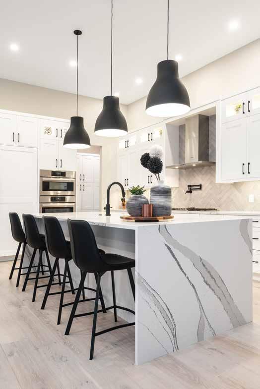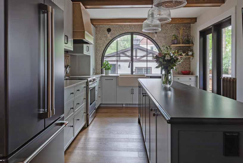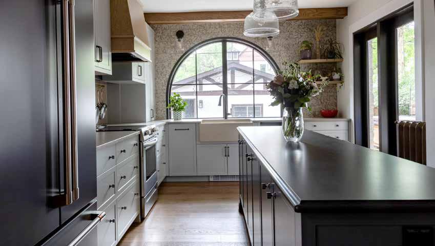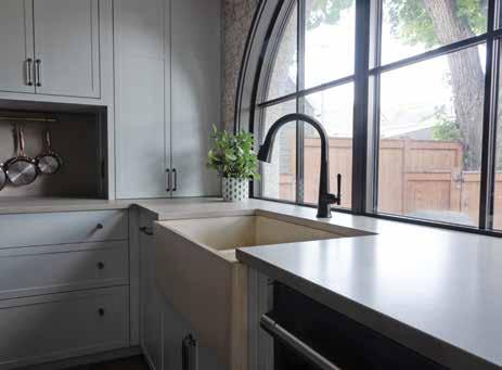 On this south Winnipeg project, Rocke Design’s plans had the new Corian quartz countertops gracefully extend into windowsills. This aspect allowed the counters to perform as practical plant ledges and add a touch of natureinspired beauty to the room. However, the biggest transformation is found at the main sink where a single patio door once stood. Rocke Design removed the door and placed an expansive arched window to flood the room with light and create a sense of openness. A Tyndall Stone wall treatment inside and outside further blurs the line between interior and exterior space.