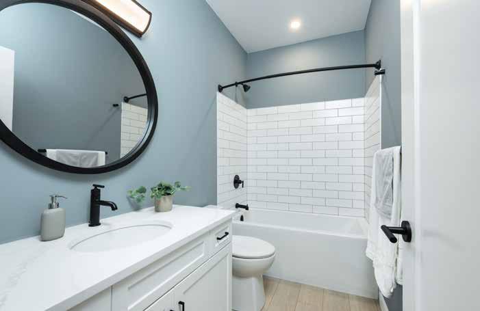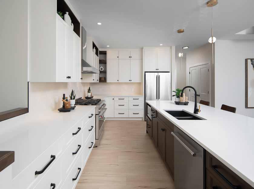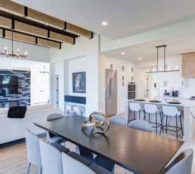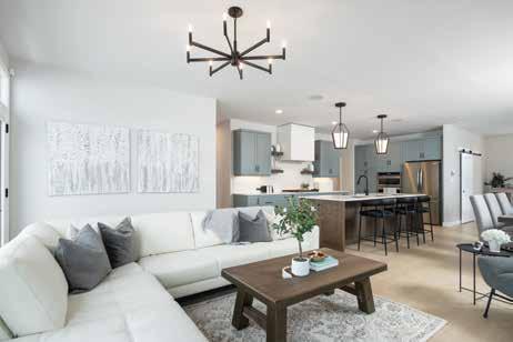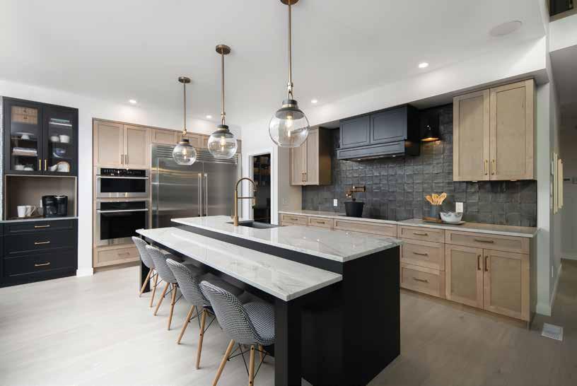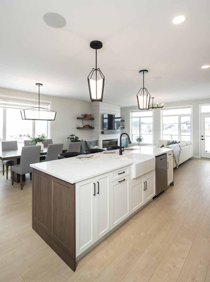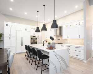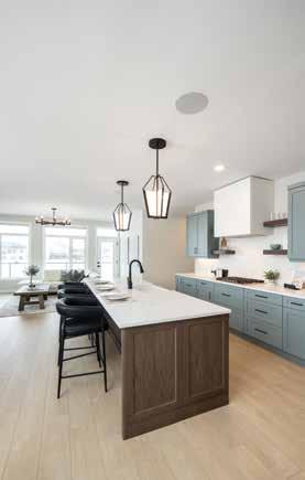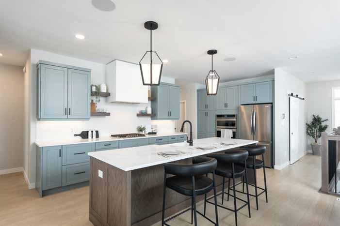 for entertaining and informal family gatherings. “To achieve our modern farmhouse look, we used classic Shaker cabinets by Kitchen Craft, incorporating a new blue tone called ‘Stillwater’”, says Chloé Shaw Neufeld, director of interior design for KDR Homes.