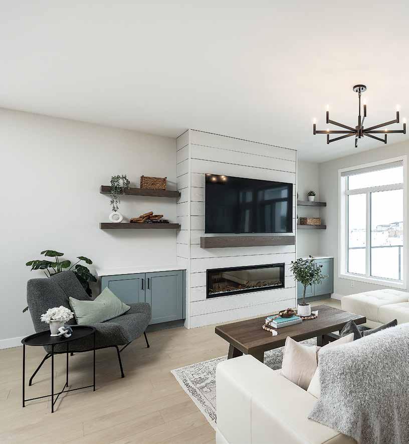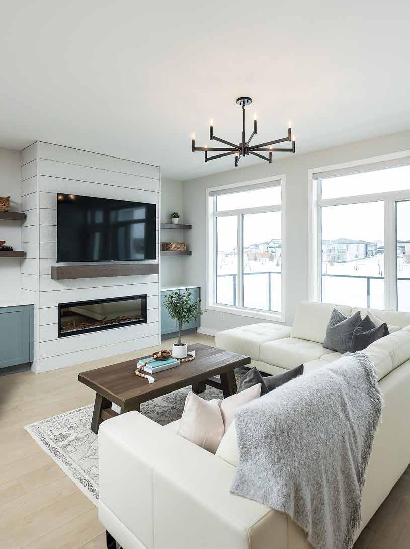 Moving through to the great room area, which is both bright and cozy, thanks to a linear electric fireplace inserted into a floor-toceiling surround with shiplap detail. Floating shelves and more Shaker cabinetry flank the fireplace for additional storage and to create a focal point for the space.
