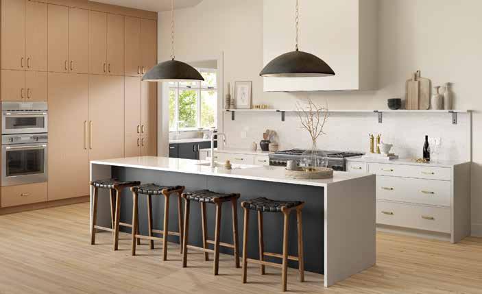 “MDF/HDF was chosen over maple due to the fact that MDF/HDF is more stable than solid wood, less likely to warp and provides a seamless frame,” says Wong. “The 3 3/8-inch wide framed door style is more on trend with its modern feel, compared to the narrower two-inch classic shaker of the past.”