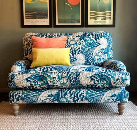 For a braver approach, colour blocking is a brilliant way to embrace the trend. Whether it’s a single bold wall or a combination of bright tones in patterns and shapes, it instantly gives a room a contemporary edge. You can easily achieve this look with Annie Sloan Chalk Paints available from Dig for Vintage. Patterned fabrics and wallpaper are another clever way to work in primary hues, like the Hokusai-inspired fabric from Linwood that has been used on the bespoke Bayliss and Booth snuggle..