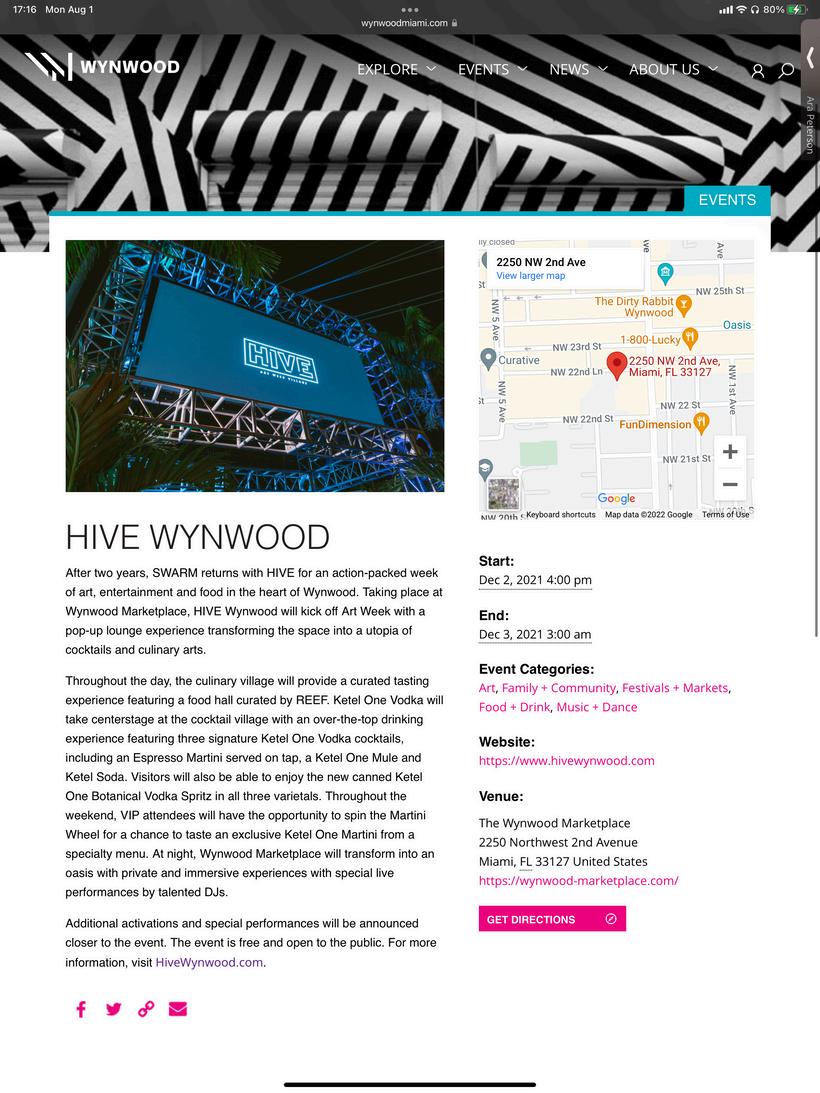 HIVE WYNWOOD IS A COMPLIMENTARY FOUR-DAY COCKTAIL AND CULINARY EXPERIENCE NESTLED IN HE MAIN ARTERY OF WYNWOOD DURING MIAMI'S ART