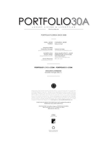 Published bimonthly, Portfolio Florida® and Portfolio 30A® are registered Trademarks. © Copyrights 2017 by Portfolio Magazine Group LLC. All rights reserved. Reproduction in whole or in part of any text, photography, or illustration only with written permission of the publisher. Portfolio Florida® and Portfolio 30A®, its officers, staff members and writers do not warrant the accuracy of or resume responsibility for any of the material contained herein. Freelance photographers are responsible for their copyrights. All photo materials, letters and text submitted to Portfolio Florida® and Portfolio 30A® automatically becomes property of Portfolio Florida® and Portfolio 30A®. Portfolio Magazine Group LLC is a Sister Company of Orlando Style Magazine LLC. Email inquiries to: advertise@PortfolioFlorida.com Portfolio Florida® and Portfolio 30A® is published bimonthly by PORTFOLIO MAGAZINE GROUP LLC POSTMASTER: Send address changes to Portfolio Florida 8810 Commodity Cir, Ste. 34, Orlando, FL 32819. PRINTED IN THE USA.