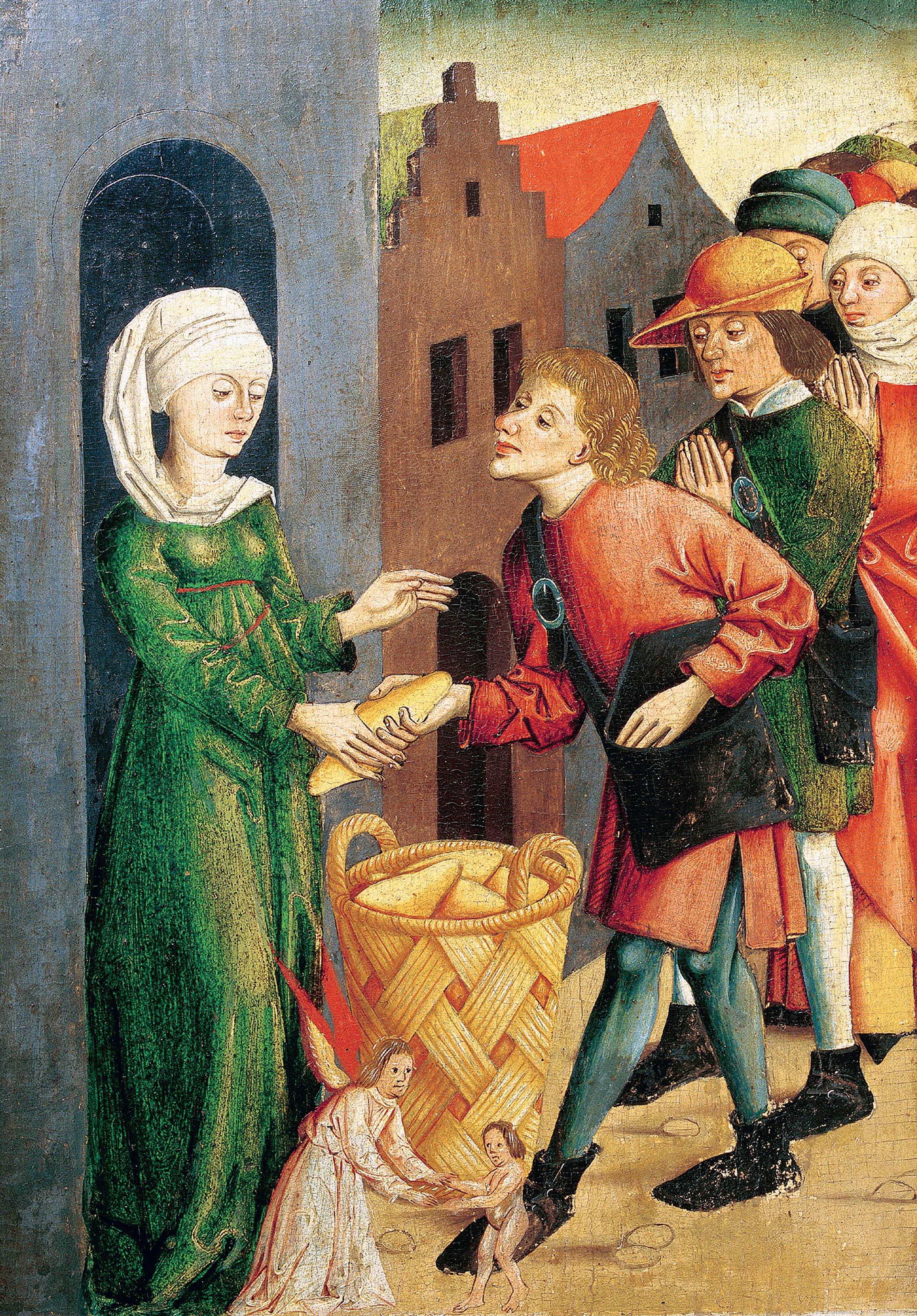 Verteilung von Brot an Hungrige. Tafelbild. Oberösterreichisches Landesmuseum.