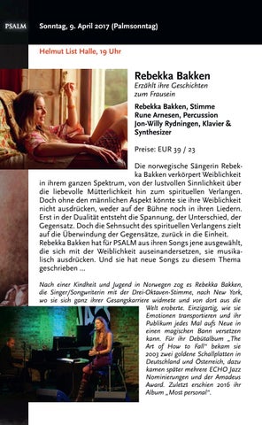 Rebekka Bakken, Stimme Rune Arnesen, Percussion Jon-Willy Rydningen, Klavier & Synthesizer Preise: EUR 39 / 23 Die norwegische Sängerin Rebekka Bakken verkörpert Weiblichkeit in ihrem ganzen Spektrum, von der lustvollen Sinnlichkeit über die liebevolle Mütterlichkeit hin zum spirituellen Verlangen. Doch ohne den männlichen Aspekt könnte sie ihre Weiblichkeit nicht ausdrücken, weder auf der Bühne noch in ihren Liedern. Erst in der Dualität entsteht die Spannung, der Unterschied, der Gegensatz. Doch die Sehnsucht des spirituellen Verlangens zielt auf die Überwindung der Gegensätze, zurück in die Einheit. Rebekka Bakken hat für PSALM aus ihren Songs jene ausgewählt, die sich mit der Weiblichkeit auseinandersetzen, sie musikalisch ausdrücken. Und sie hat neue Songs zu diesem Thema geschrieben ... Nach einer Kindheit und Jugend in Norwegen zog es Rebekka Bakken, die Singer/Songwriterin mit der Drei-Oktaven-Stimme, nach New York, wo sie sich ganz ihrer Gesangskarriere widmete und von dort aus die Welt eroberte. Einzigartig, wie sie Emotionen transportieren und ihr Publikum jedes Mal aufs Neue in einen magischen Bann versetzen kann. Für ihr Debütalbum „The Art of How to Fall“ bekam sie 2003 zwei goldene Schallplatten in Deutschland und Österreich, dazu kamen später mehrere ECHO Jazz Nominierungen und der Amadeus Award. Zuletzt erschien 2016 ihr Album „Most personal“.