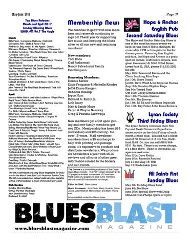 Membership News We continue to grow with new members and renewals continuing to sign on! Thank you for supporting live music and keeping the blues alive to all our new and returning members! New members: Toni Roca Gail Rothermel Nancy Salvadorini Family Eric Simpson Renewing Members: Dennis Barker Dixie Ferguson & Michelle Rhodes Jeff & Diane Haugen Rebecca Heaslip Joyce Hunt Richard A. Kubly Jr. Link Leary Matt & Sandy Mace Karen & Wayne Naleway Greg & Patricia Zachweija New members get a CD upon joining and new family members get two CDs. Membership has been $15 (individual) and $25 (family) for over 15 years. Mail newsletter members have a $5 surcharge to help with printing and postage costs; it’s expensive to produce and distribute newsletters. We produce six newsletters a year with 25-30 reviews and all sorts of other great information related to the Society and our events. The Groove is a bi-monthly publication of the Crossroads Blues Society. The PDF version (typically 24 to 32 pages) is emailed to members of Crossroads. Hard copies (12 pages) are sent out to members without email ($5 membership surcharge). Editor in Chief: Steve Jones Music Reviewers: Rick Davis, Marty Gunther, Steve Jones, John Mitchell, Mark Nelson and Mark Thompson. All un-credited content by Steve Jones