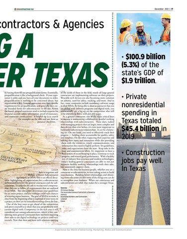 to the needs of those in the field, nearly all large general contractors are implementing software on their projects. Wearable tech devices are also becoming more common on jobsites, used for safety, tracking, and more. And in fact, some companies include mandatory software usage in their MSAs. By being able to show a contractor that you are skilled with software programs and digital tools, you automatically get a leg up on the competition who still write everything down with pen and paper. As a general contractor, one of the most critical keys to success is maintaining collaborative, fruitful working relationships with subcontractors. These days, tasked with managing projects that are larger, more complex and data-driven than ever before, it’s even more important to build solid subcontractor relationships. It can be a balancing act. On one hand, you need to effectively track their progress — holding them accountable for quality, safety and timelines. On the other, respecting their expertise and seeking their input and innovation while also providing them with the resources, timely communications, and information they need to highly perform. Set guidelines, rules, and expectations from the start. Keep subs in the loop and communicate often. It’s important to have a fluid system of record keeping in place. Continue to track progress, and reward good performance. With a healthy mix of industry best practices and modern technologies, today’s leading general contractors are able to not just maintain healthy working relationships with their subs, but consistently improve them. Now is the time for business people, whether you are a contractor or subcontractor, to start taking action to build your business. Building better relationships and obtaining more education are just some of the things you can do to strengthen your business. When our contractors and subcontractors are solid, that makes for a stronger Texas.